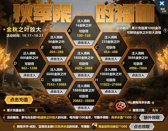 1、活动期间,累计充值满1000金币可解锁金秋之叶放大资格。