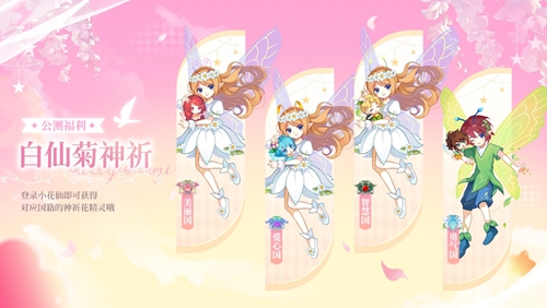 4月3日公测后,小仙子们登录游戏,前往公测福利-神祈福利,即可领取对应国籍的花精灵礼物(每个国家可领取2只花精灵哦~),其中一只花精灵可用于开启对应国籍的白仙菊/芦苇草神祈!